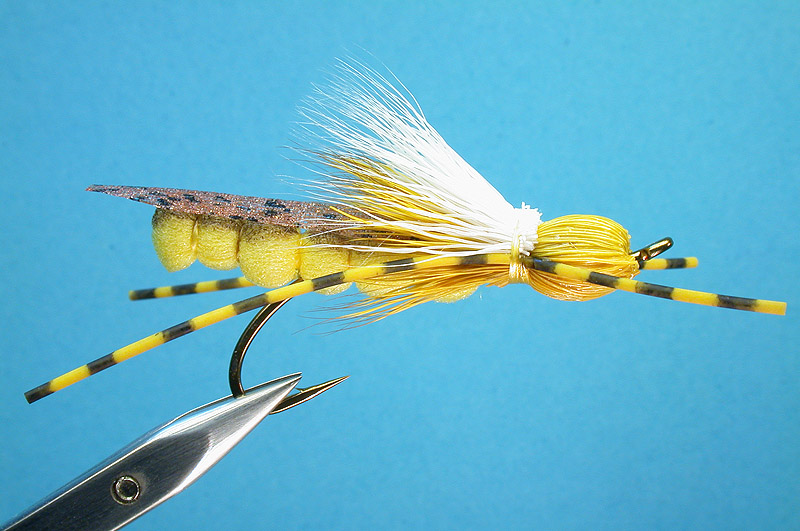 | Extended abdomen: | Yellow 3mm open-cell foam – first three segments tied on a needle, then removed and attached to the hook shank |