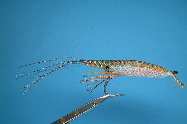 This is by far the top producing barramundi fly in the Hinchinbrook Passage area. A young guide named Rob Laspina developed it. The barras cruise along the edge of the mangroves on a falling tide and ambush prawns. The prawns will literally fly out of the water to escape the 'mundis. Coating the body with Softex or Flexament traps air inside. The stiffended tail acts as a diving lip. You fish this fly using a couple quick strips to cause the fly to dive and then let it float back to the surface. The barra strikes come as a complete surprise in the murky water. The fly also took flathead, trevally, threadfin salmon, mangrove jacks, and queensfish. The fly is nearly snag-free because the tail causes it to flip over the mangrove roots. |