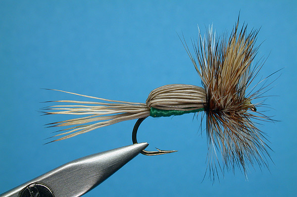 | Hackle: | Brown and grizzly mixed, tied very full |