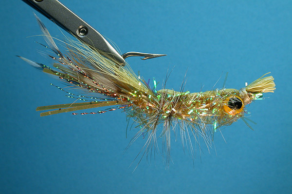| Tail: | 4 strands each peacock & gold Krystal Flash, short; small tan rabbit slightly shorter than Krystal Flash; 2 pair gold Sparkle Sili Legs longer than Krustal Flash; one Cree hackle each side, longest of all |