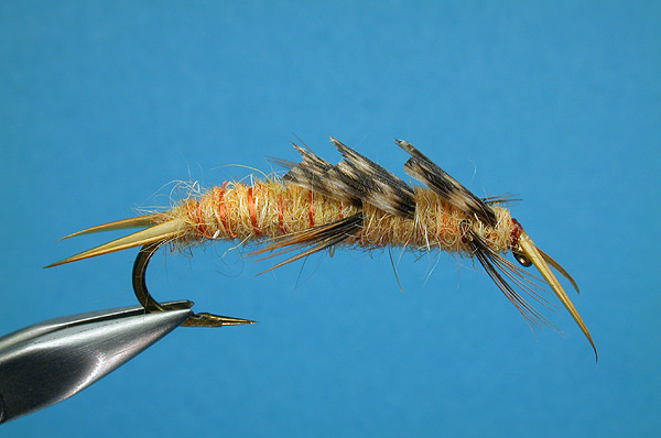 | Body: | Hareline dubbing, 45% goldenrod, 30% brown, 25% cream, hand blended |