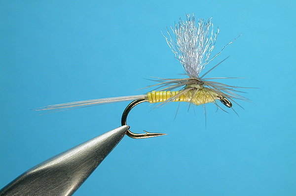 | Abdomen: | Yellow “PMD” stripped hackle quill |