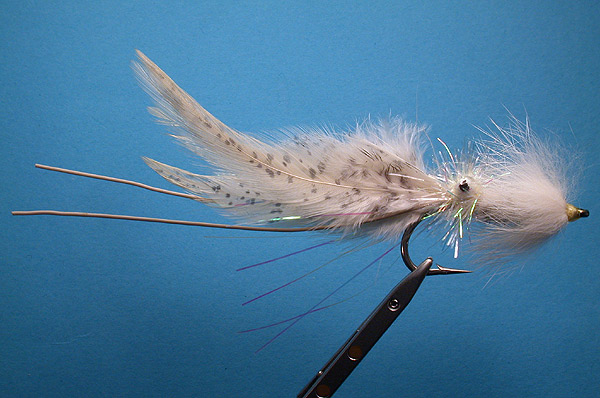 | Legs: | two rubber legs, saddle hakles, Krystal flash, Marabou |