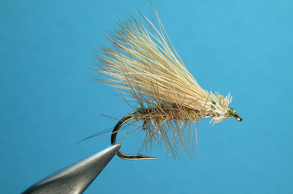 | Wing: | Elk hair, tan, tilting slightly upward |