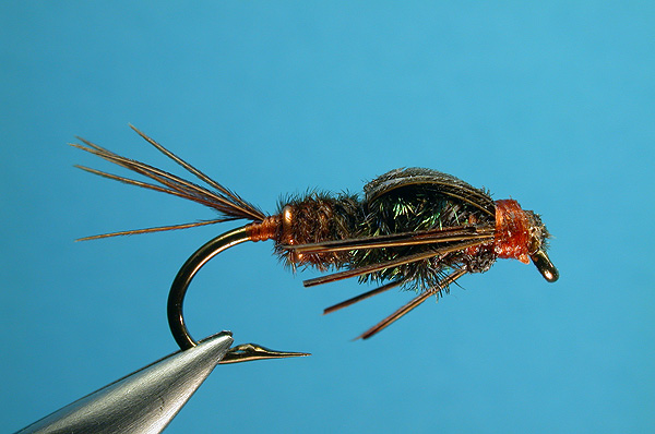Underbody 2 or 3 layers of copper wire. Overbody 3 or 4 strands of peacock herl twisted and wrapped to behind eye. Bring pheasant tail barbs over top of abdomen; tie down behind eye to make wing case. Pull 3 barb back and to the side on each side for legs. |