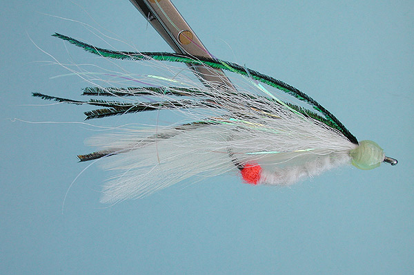 | Wing: | Four white saddle hackles, pearl crystal flash or flashabou, white bucktail, peacock herl |