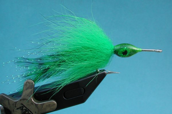 | Collar: | 4 chartreuse grizzly neck hackle, 2 each side splayed out, 3 strands chartreuse krystal flash on each side |