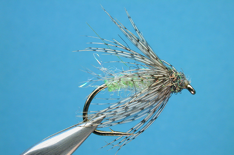 | Abdomen: | cream trilobal dubbing + pearl Ice Dub in a green monofilament dubbing loop |