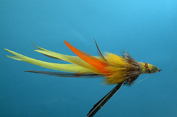 Note: Just a basic diver with rubber legs. The legs are attached to the finished fly by threading the rubber legs through the deer hair head from side to side with a sharp needle. To embellish a diver, you can use different colours of deer hair to build up the head, either in a random fashion or in specific patterns. For the basic Diver pattern, click here. |