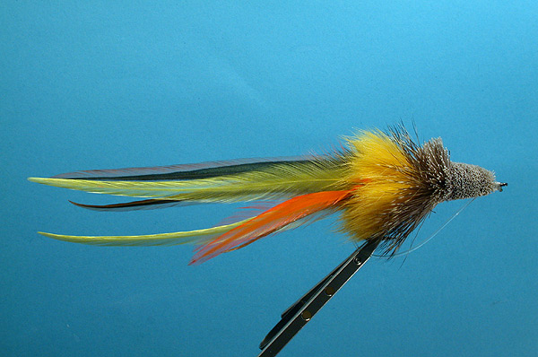 Note: Just a pretty average Dahlberg diver type fly, a little more elongated than average. Weed guard is tied 2/3 down into the bend first thing. Then the fly is tied as you would normally. Make a narrow whip finish, and attach the mono to the underside of the whip. Measure the final size of the guard loop and pull through an additional 10-15 mm. Finish the whip with a firm knot. Cut the mono 15mm beyond the knot and melt the end to a knob. Let it cool and then pull the mono loop back until the mono knob is seated firmly against the end of the whip finish knot. |