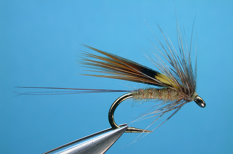 | Wing: | French Partridge body feather, dyed in picric acid, rolled |