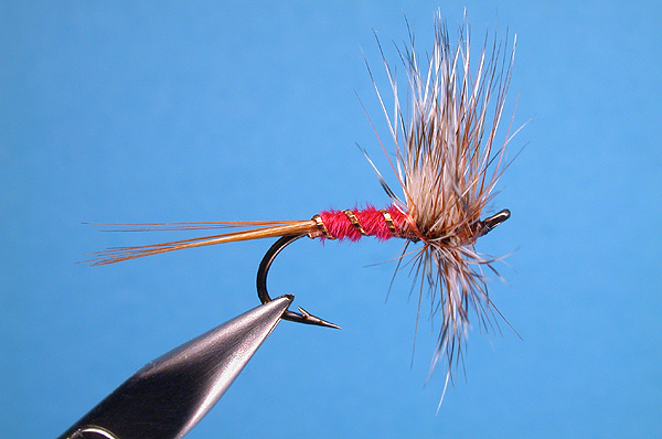 | Hackle: | One each of greyish, poorly marked, grizzly and Rhode Island "red" |