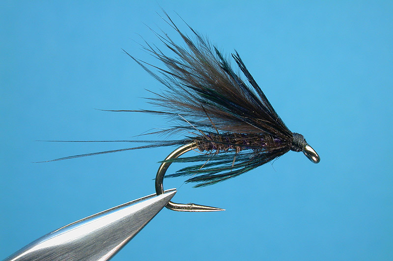 | Wing: | Fluey hackle barbs from base of stem, grey |