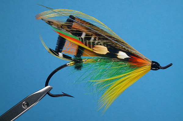| Wings: | Mixed - Golden Pheasant tippets (back to back); "married" strands of yellow, orange and green Swan, Florican, Peacock wing and Golden Pheasant tail; "married" narrow strips of Teal and barred Wood Duck; narrow strips of brown Mallard over |