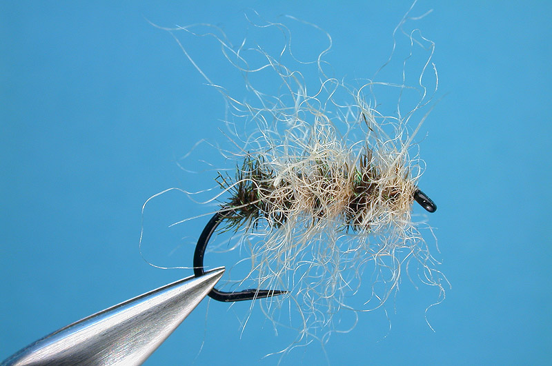Snowshoe hare, cream, inserted into split thread; peacock herl - twisted together