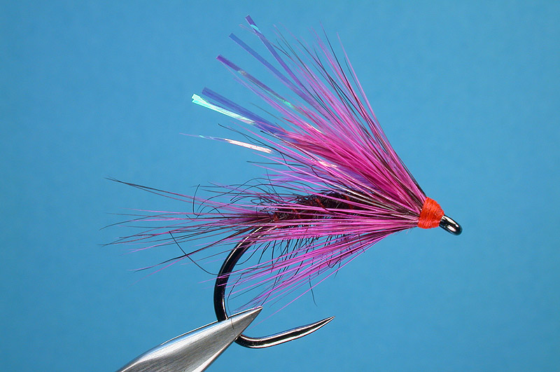 | Underwing: | Grizzly saddle hackle fluey barbs, dyed pink, tied short |