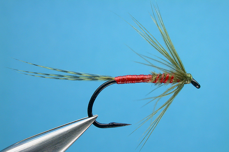 | Thorax: | Pintail barbs, dyed olive, continuation of tail material wrapped to shape a slender thorax |
