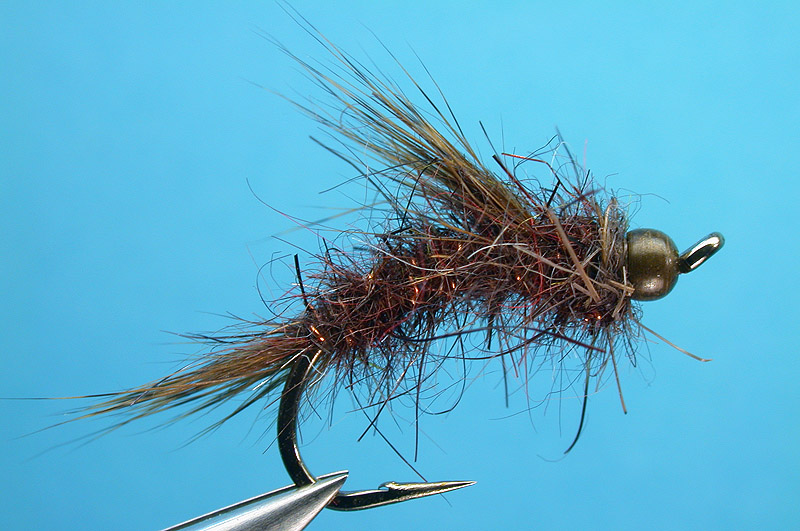 | Body: | Dubbing bush with twisted copper core, brown natural dubbing with added flash |