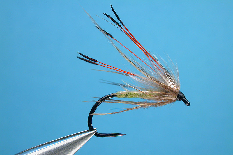 | Wing: | Golden pheasant tippet barbs, dyed hot orange - sparse |