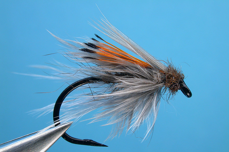 | Thorax: | French partridge grey body feather aftershaft, twisted around tying silk |