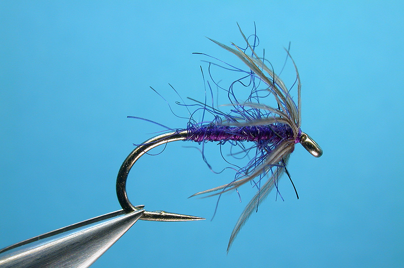 | Rib: | Tying silk, split, small amount of purple seal's fur inserted, twisted and spiraled back to eye of hook |