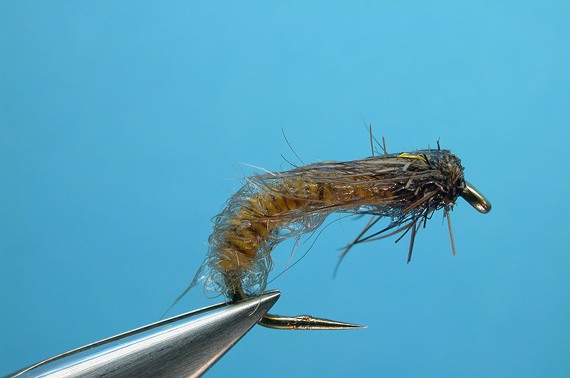 | Abdomen: | Narrow amber ribbon from produce bag, doubled into loop, marten underfur inserted, corded |