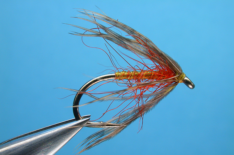 | Rib: | Tying silk, split, small amount of hot orange seal's fur inserted, twisted and spiraled back to eye of hook |