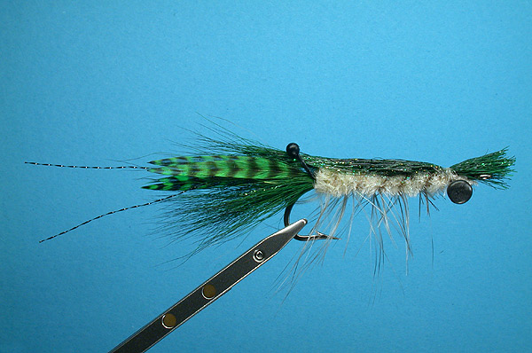 | Claws: | Dark green grizzly hackle tips |