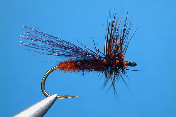 | Hackle: | Dark Gray Grizzly or Dark Dun trimmed flat on the bottom |