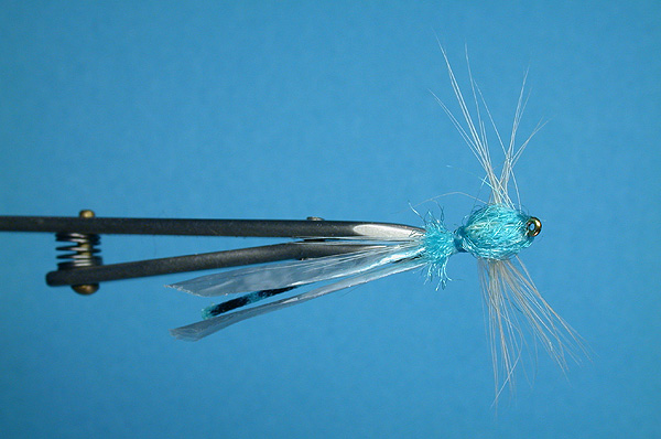 Except for the wings and hackle this fly is tied with all white material. Use blue marking pen to color thread and other white materials as you tie. Large white or cream tied parachute around the thorax body. Body material is then pulled forward and tied at the head, then folded to the rear and tied off at the rear of the thorax splitting the hackle to each side. |