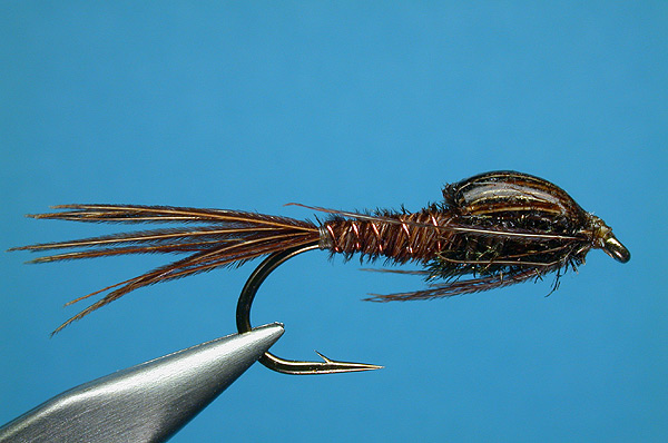 | Thorax: | Peacock with pheasant tail pulled over the top and epoxied |