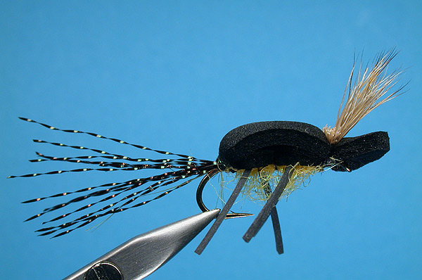 | Shellback: | Black foam or color of choice. Closed cell foam strip tied in at head extending back. Tied down at rear and folded back to head. Clip leaving a lip above the head. |