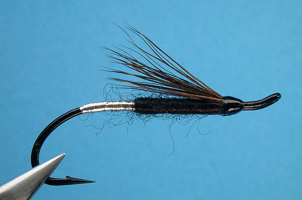 Note: Another Newfoundland standard, this minimalist fly is used in all sizes. In sizes 4 and larger, a tail of golden pheasant crest and a flat silver rib are sometimes used. In the smaller range, this can be an effective riffling fly, with the stiff moose hair contributing to its surface action. |