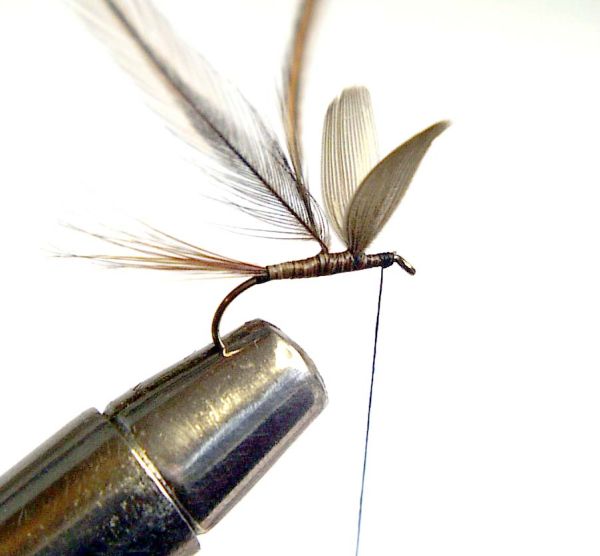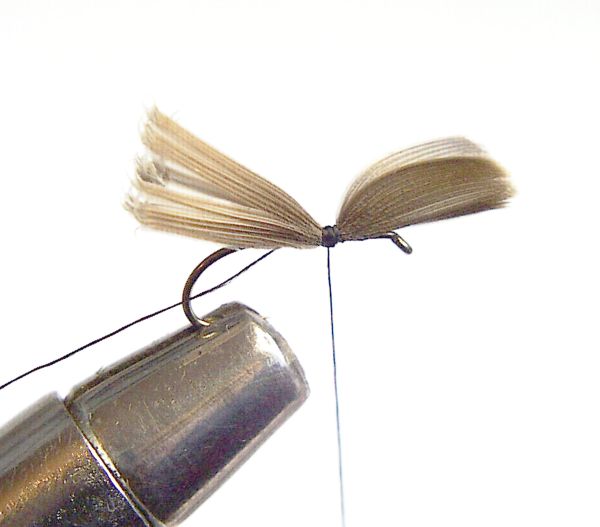 Tying instructions: Step by step photographs - John Morton Place hook in the vice, holding the hook at its bend in the vice jaws and the point covered by the jaws. *** The Underwrap *** Starting 6mm back from the eye of the hook lay down a close wound bed of tying thread along the whole length of the hook as detailed in lesson one; to a point halfway between the hook point and the hook barb. Leave at least one millimeter of clear hook at the eye of the hook ![]() Make a small thread wraps bump where the tail fibers will be tied in. This allows the tail fibers to fan easily. ![]() *** The Tail *** From the side of the neck cape of a brown rooster, select a feather. These feathers on the side of the cape are stiffer than elsewhere on the cape and have little or no soft center web or `flue' as it is often referred to. In literature these feathers are often referred to as 'spade' hackles. Strip off some of the base, hold the feather by it's tip in your right hand, stroke the spicule’s rearward with your left hand to `open' the feather and pull off a pinch of feather with your left hand. Snip off the rough base where it has torn away from the central spine plus any soft basal flue if you didn't use a side cape feather and mount it on the hook with three fixing loops, allowing the tail to be equal to the length of the hook. Hold the tail fibers firmly in the left hand, and wind rearward to just at the base if the thread nodule. Release the left hand and make one more turn rearward into the base of the thread nodule. Watch the tail open and flare outward to provide a wide platform at the hook rear for stabilizing the fly when it is on the water If you have followed this instruction exactly as you have read it, then there will have been no need to change hands or turn the material over to achieve a position where it can be successfully applied to the hook. You r fly should now look like the picture, and be ready for mounting the quill body and front Hackles. This is the whole point of tuition by technique tying, and enables the tyer very quickly to attain `professional' status in the quality and appearance of their flies. Your fly should now look like the picture. ![]() *** THE WING *** I have seen many ways and methods used to wing a dry fly and all of these have depended on continuous practice to achieve a good pair of unsplit wings, sitting upright. The following method is almost foolproof, and ties perfect wings every time, for both beginner and advanced tyer alike. Start with returning the thread to a position one third of the way along the hook shank from the hook eye. You can also, if tying a batch of flies and doing wings only, start with the first tying thread winds at the eye of the hook, winding back ten turns and then advancing three turns to achieve the correct position on the hook to mount the wings. This is where the first tie-down loop will be placed. Preparation of the feather to be used and the right "dressing" of each wing is most important, and it is this care that will ensure that the wings you tie will look and sit well.