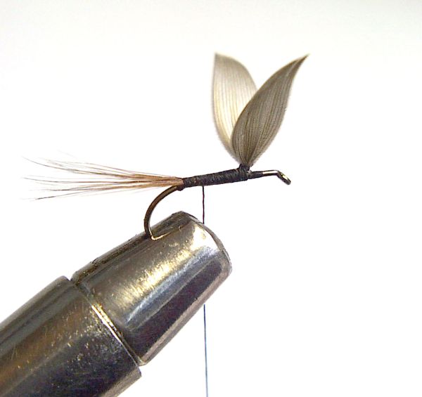 The two segments, one from each wing feather are fitted back to back so that the tips curl outward from each other and each set of tips are level in length. They are now ready to be tied on the hook. If you are not prepared to carefully study and follow the above moves, your wings will not always be perfect. *** MOUNTING THE WINGS. *** The next stage is to hold in the left hand the feather wing butts in their back to back, outward curled position, with the tips exactly even with each other in length. Hold in the left hand and place the feathers over the hook for tying in, and lay them along the hook shank with the wing tips pointing forward over the hook eye. The correct wing length is exactly equal to the whole hook length. The tie down position must be well covered by your left hand before the first fixing loop is made. Make this first tie down loop while holding the hook, feather wing sections, and thread all very firmly in the left hand. Once this first loop is made, lift the thread and bobbin to a position directly above the hook. Then, and only then, open the left-hand finger and thumb by relaxing the left-hand grip slightly. Move the right hand and bobbin approximately half an inch rearward before making the next turn of thread around the hook. This movement rearward is the most vital part of the winging process, as it clears the thread from catching the now positioned wings and thus rolling them off line. Keep checking this point till it becomes a habit and you always do this. Now, wind the second turn of thread tightly behind the first; move in a rearward direction on the hook. Note: - This second wind is not a fixing loop. Keep winding another 10 turns or so in a rearward direction; --- hold up the feather wing butts with the left hand and snip off the excess material. Wind a few neat turns over the trimmed butts to form a nice smooth taper to the body and return the tying thread to as close behind the wing as possible. Drop the bobbin from your right hand and in the ball of flesh between your right thumb and forefinger. Grasp the wings and the hook so that they are held in the center of the ball of flesh. Hold tightly, and roll your right hand to a vertical position. This will lift the wings to an upright position rather like the opening of a door with your thumb and forefinger as the hinge. Your right forefinger will be behind the hook shank, and will be supported against the hook shank and against your thumb on the other side of the hook shank. Now: slide your right thumb vertically upward until it just clears the hook shank and you can see the wing root and the hook underneath it. Remember, your forefinger is now the main support to your right hand and maintains it's position by using the hook shank it lies against as a brace to hold itself still and steady and maintain a constant upward pressure on the wings. ![]() This upward pressure or pull should be such that you are starting to straighten the hook in the vice with the strength of the upward pull. At this point, pick the bobbin up in your left hand and swing the bobbin three times around the hook from back to front, (clockwise), like the top rotor movement of a helicopter blade. I.e.: horizontally around the wing root base. This will position three turns of thread tightly against the wing roots that are being pulled strongly upwards, and fix forever their position on the hook. Immediately after these last three horizontal turns of thread take two more `locking turns' around the hook from behind the wings in the normal manner before releasing the upward pull of the right hand. Your wings are now perfectly set and in position. Separate the wing with a light flick of the finger against the rear of the wings, or use a needle. Holding the bobbin once again in the right hand, make one wrap up and over to the far side of the hook passing between the wings in the first wind of a figure eight tie. The thread has just passed through the wings from back to front. Complete the wind and make a second wind through the wing, this time passing from front to rear. Repeat the sequence, and take the tying thread to the rear of the hook ready to mount the tail of the fly. Congratulations, you have just mastered the so-called `difficult' art of winging a dry fly. Tie a few more wings to fix this lesson and the tying sequence in your head for all time. Now, take the tying thread to the rear of the hook. ![]() *** FLY BODY *** Select a good full herl from just below the ring of the `eye' of an eyed peacock feather, and strip off the flue from the base of the herl by pulling the herl between thumbnail and ball of forefinger. Strip in small increment, scraping toward the butt of the quill. Do each side of the quill, until about two thirds of the quill is free from fibers. Tie this herl in at the rear of the hook, by the butt and tie the butt down securely. Take the tying thread forward to a position 3mm behind the wing position. Select two hackle feathers from a good quality cape. Strip off the soft `flue' from the base. Lay the two feathers back to back and lay across the hook shank against the body thread. Tie the hackle down exactly at about the 3mm position behind the wings and tie in the hackle roots by winding tightly and compactly rearward toward the tail. Snip off the hackle butts and build the underbody with the thread to a nice even tapered profile with as few winds as can be managed to achieve this nice shape. Take the tying thread to a point exactly halfway between the front of the wings and the eye of the hook. There should be about two `hook eye lengths’ of space on the hook shank in front of the thread at this point providing the wings were tied accurately in position in the first place. This will be the area left to form the head of the fly. Now wind in the stripped peacock herl for the fly body. Take it up to and past the hackle feather position, and wings. Tie it off and restore the tying thread to the 3mm position (two hoo