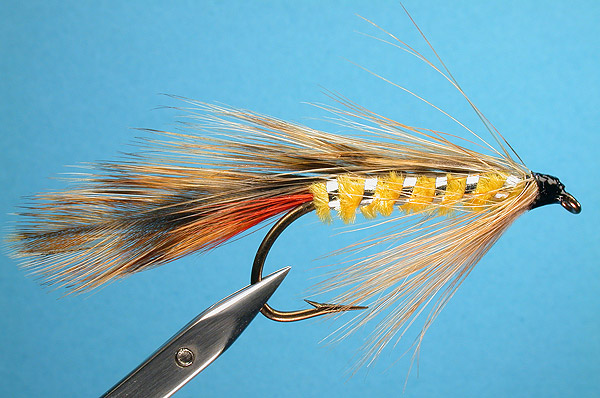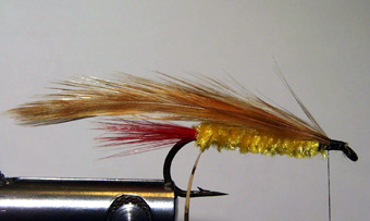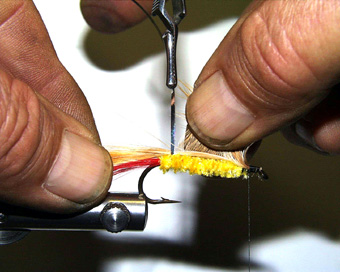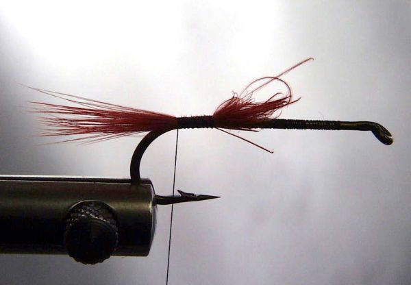 Tying instructions: Step by step photographs - John Morton Place hook in the vice, holding the hook at its bend in the vice jaws and the point covered by the jaws. Hook Size Streamer Flies are usually tied on hook sizes between #8 to #2 or larger. The choice can be left to you. I prefer the medium size of #4 hook for my Streamer patterns with smaller flies for smaller waters, and large flies around #2 for night fishing or for heavy flows. Another rule of thumb is to use larger flies early in the season when the waters are traditionally higher, with more volume. Use smaller flies in low water summer conditions. *** The Underwrap *** At the front of the hook, observing the space reserved for the head tie area, lay on a close wound bed of thread along whole length of the hook to a point above the halfway mark between the hook point and the barb. While winding, hold the short end of the thread in the left hand; taut, and at a slight rearward angle. This will pack each wind of thread to form a tight underbody that will not roll. This is the basis of all flies you will tie. Thread underwrap finish point should lie ha halfway between hook point and the barb as shown ![]() *** The Tail *** Hold a dyed red rooster feather in the right hand, by its tip. Stroke this feather with the left hand to `stand out’ all the barbules at right angles to the center spine of the feather, strip off the soft flue base of the feather. Take a quarter inch pinch of barbules between the thumb and forefinger of left hand, and tear off with a rearward movement. These spicules are to tie in as the tail material. For correct proportions the tail length should be the same length as the bed of thread along the shank of the hook. Fix the red barbule tail material over the last underwrap of thread with three `fixing loops’. Cut off the feather butts and wrap in butts firmly. Return thread to the rear of the hook to lie over the last underwrap, thoroughly and firmly tying down the butts of the red feather spicules. If you lift the tail at this point you should not be able to see any black tying thread showing under the tail. If you can, gather the spicule’s in your left hand and wind a few more rearward turns to place the thread in the right position for the next move. ![]() *** RIB and BODY *** Take a five-centimeter piece of yellow chenille and strip a quarter inch of chenille away, to expose the twin cotton center core. Tie in this center core directly over the first tie down wrap at the start of the tail. Tie in a five-centimeter strip of oval tinsel with three `fixing loops’, about a millimeter in front of the chenille. Tie in chenille and tinsel butts firmly, and advance thread to the eye of the hook. ![]() Apply a liberal coat of cement over this wrapping for extra strength and wind the chenille to the hook eye, using tight, closely wound wraps. Use either your fingers or hackle pliers for this. Tie off, and clip away excess material. Remember not to move into your reserved head area at this point with anything other than tying thread ![]() Take four honey grizzle feathers and place together two feathers for each side of the wing (four feathers in all), so the concave (curved) side of each pair of the feather’s lie facing together, with the tips all meeting together. The wings are then mounted over the hook using the right hand to measure the wings for size. The correct proportion is two shank lengths of the feather extending rearward from the tie in point, or to put it another way a tail length beyond the fly tail. Clip off the surplus feather, hold the wing group by the tips and strip out all loose spicule’s at the butt ends you have just cut, and align all wing feather center spines so the wings all lie together in a straight line with the tips facing rearward. Take the wings in the left hand and place in position over the reserved head area to tie onto hook with the first `fixing loop’ tying down at the rear of the space left at the hook eye. If the feathers are properly positioned, the ends of the butts should not obscure the hook eye. If badly positioned and the butts do extend over the eye, then trim off excess butts, and bind down neatly to form the start of a good flat head taper. ![]() Finishing the rest of the Wing, and Rib with Tinsel Return the tying thread to the start point of where the wings were tied in, binding down the wing butts. We now wind in the tinsel. Take one wrap of the tinsel round the hook shank, over the tail and bring it up into the chenille bed. The tail of your fly will stay in position with the feathers correctly aligned if your first rib tie-down is bedded in the chenille body. Leave the tinsel to hang underneath the hook shank attached to a pair of hackle pliers. It is most important to take care with this last move, or the wings will not lie along the hook shank properly when bound down. To effect the ribbing, stroke the wing feather tips together neatly to align them before grasping them firmly at their very tips with the left hand. With the right index finger in the eye of the hackle pliers, pull the tinsel up vertically and keep it taught. Adjust the distance between hackle pliers and top of the hook if necessary so that the thumb and third finger of the right hand can reach down comfortably to work with the wing. Stroke the wing feather spicule’s forward with the thumb and third finger of the right hand to make an opening in the feather wing. This opening should be exactly at the point where the vertically held tinsel touches the wing. With the left hand holding the tips of the wing pulled tightly rearward, move the right hand slightly away from you so that the tinsel passes through the opening just made by the thumb and third finger. Release the thumb and third finger of the right hand. ![]() Now, release the left hand holding the wing tips, move this hand forward to the tinsel for the next move. To rib the wing properly, carefully comb the opening that the tins