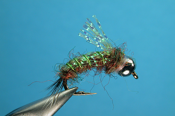 Tying Note: Tie in the tail. Tie in the flash and rib. Dub the abdomen, pull the flashback forward and counter-wrap the rip. Pull the flashback rearward, wrap the thorax and whip finish. Trim the wing to length. MFG (Montana Fly Goods) dubbing is a multi-color blend of synthetic fibers. |
