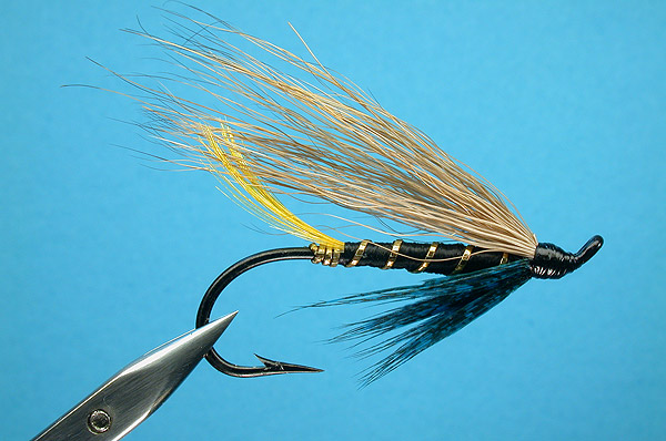 | Hackle: | Guinea fowl dyed blue, tied beard style |
