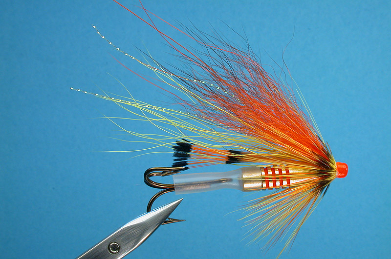 | Wing: | in this order: 2 sections of GP tippet dyed red; bunch of yellow bucktail; 2 strips of yellow Midge Crystal hair; bunch of hot orange Arctic fox |