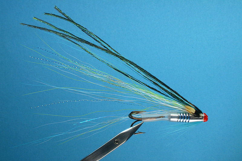| Wing: | in this order: 2 strips of blue Mirror flashabou; tiny bunch of white bucktail; 2 strips of fluor green Midge Crystal hair; tiny bunch of fluor green bucktail; 2 strips of blue Midge Crystal hair; tiny bunch of blue bucktail; Over the wing4-5 barbs of peacock |