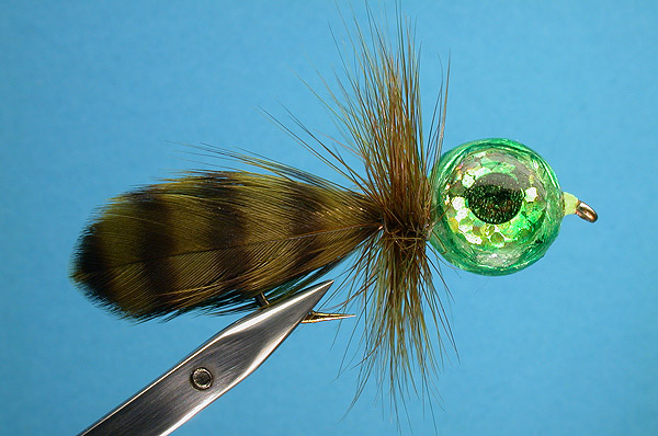 Note: Original streamer pattern for predator freshwater species critical focus on large baitfish eyes. Eyes are supported on shank by cut bubble-wrap pieces and 2-ton epoxy overcoat with green marker tint No worries about hook-gape bite; ¾ of fly is clear being composed of soft body materials.