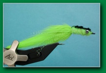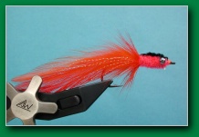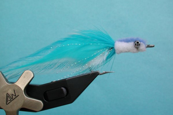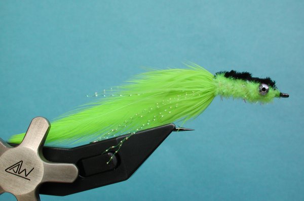 | Head: | size 3 Salt water chenille, with the darker chenille tied in at the back, and laid over the top of the lighter chenille and tied off behind the eye of the hook |