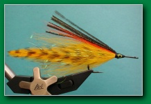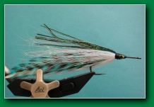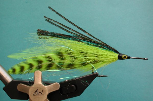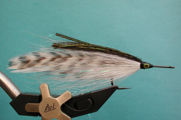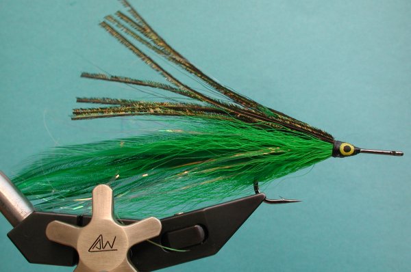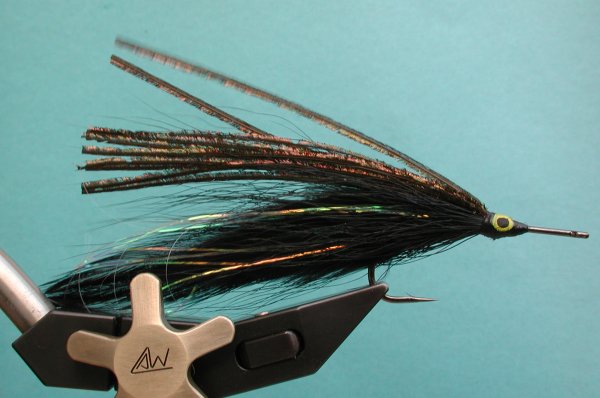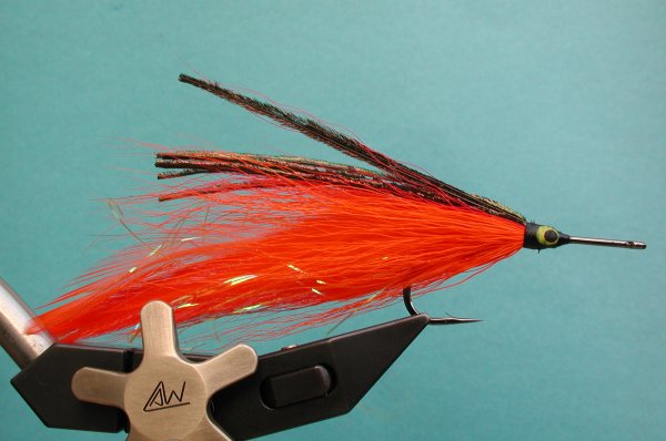 | Wing: | 6 saddles 3 each side , flashabou, darker bucktail, peacock herl | |