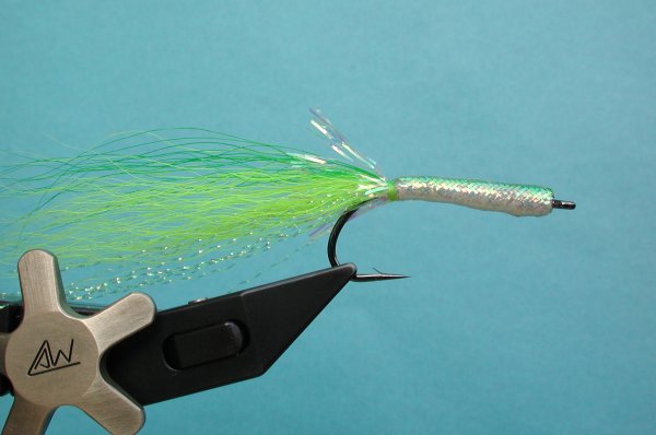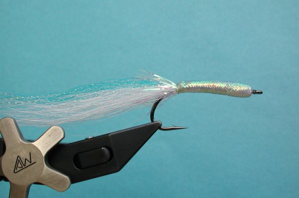 | Body: | pearl tube over some strands of bucktail over chenille tied on hook, then coated with epoxy |