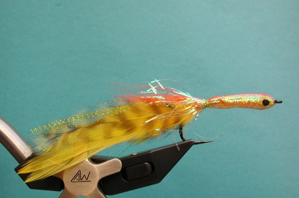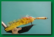 | Body: | pearl tube over some strands of bucktail over chenille tied on hook, then coated with epoxy |
