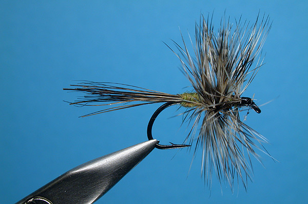 I like the 102Y’s larger gape for this fly, as it allows me to tie a longer tail and use a larger than normal hackle to give the illusion of a larger bug while still using a relatively small hook. The dubbing is a blend of seal, beaver and finely chopped golden olive antron for a little flash.