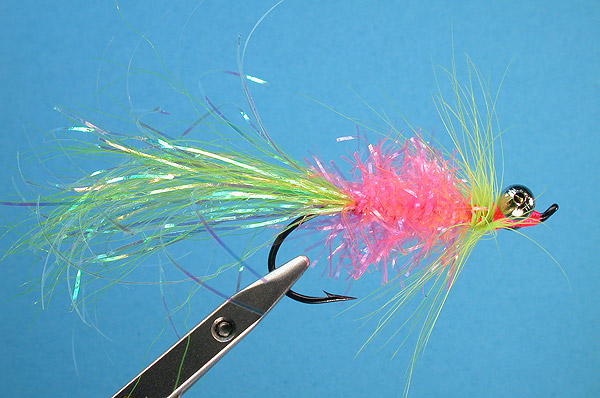 Note: It is doubtful that the type of material used for the tail is important as long is it is active and flashy. I prefer Wing ‘n’ Flash or something similar. For the type of fishing I do for salmon (deep-ish runs and pocket water), I feel it is important to show the fish a large and aggressive fly. However, regulations limit the hook size to that of a ½” gap. Therefore, tails become important to boost the profile and add aggravating action. |