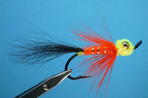 | Head: | Gold bead eyes, figure 8 wrapped with fluorescent fire chartreuse chenille |
