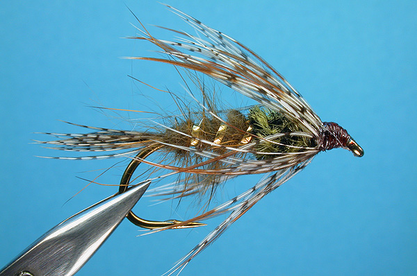 | Body: | Rear 2/3 is dyed gold/olive rabbit with small gold oval tinsel rib, Front 1/3 is variegated black/olive chenille |