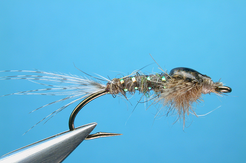 | Thorax: | black and pearl krystal flash from rib and back tied over mottled oak thinskin w/ three coats (min.) of Hard as Nails |